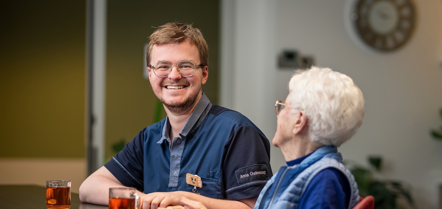 “Omdat mijn moeder chronisch ziek is, heb ik op jonge leeftijd al veel zorgverleners gezien. Ik dacht: dat werk wil ik ook doen. Ik heb geprobeerd om geneeskunde te studeren, maar ik werd een aantal keer uitgeloot. En de hbo-opleiding die ik daarna volgde vond ik te theoretisch, daarom ben ik overgestapt naar het mbo.” Hij vond ‘zijn plek’ in de ouderenzorg. “Dit past bij mij, omdat ik graag een band met de ander opbouw. Ik vind het belangrijk om de mens te zien, goed te luisteren en daarop in te spelen. Bijvoorbeeld: als je iemand verrast met lievelingseten kan dat heel veel betekenen voor die persoon.”